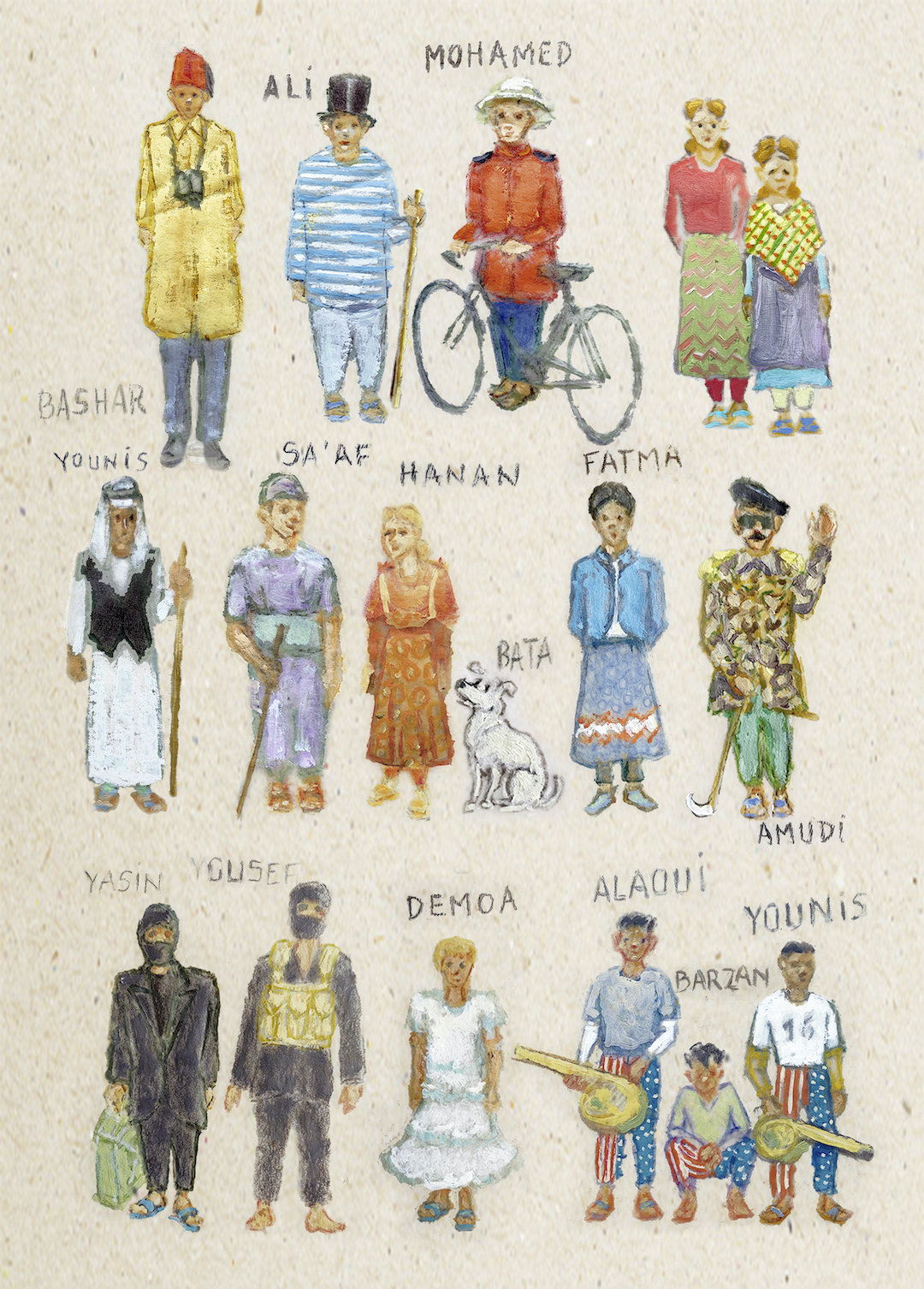 Mohamed (der Engländer), Ali (der Franzose), Fatma (Erzählerin), Demoa (Begleiterin der Erzählerin), Younis (der Araber)